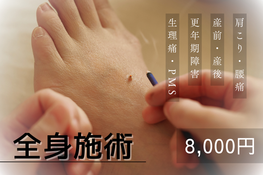 施術着に着替えていただきます。脚、お腹、背中、頭と全身の状態を診ながら主にお灸を使って施術を行います。鍼も時々します。